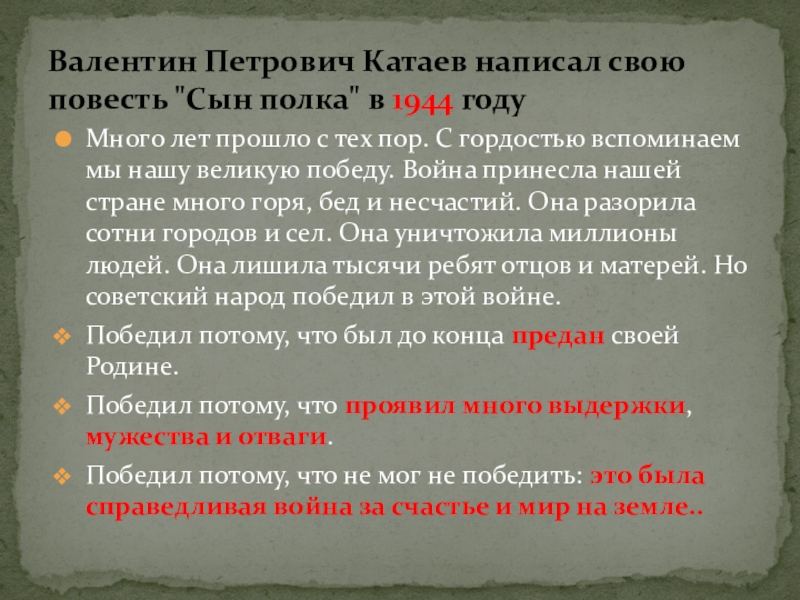 великую победу. Война принесла нашей стране много горя, бед и несчастий. Она разорила сотни городов и сел. Она уничтожила миллионы людей. Она лишила тысячи ребят отцов и матерей. Но советский народ победил в этой войне.