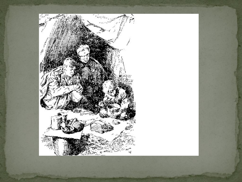 Слайд 9Его поселили в замечательной палатке у двух разведчиков, Василия Биденко и Кузьмы Горбунова, и накормили
