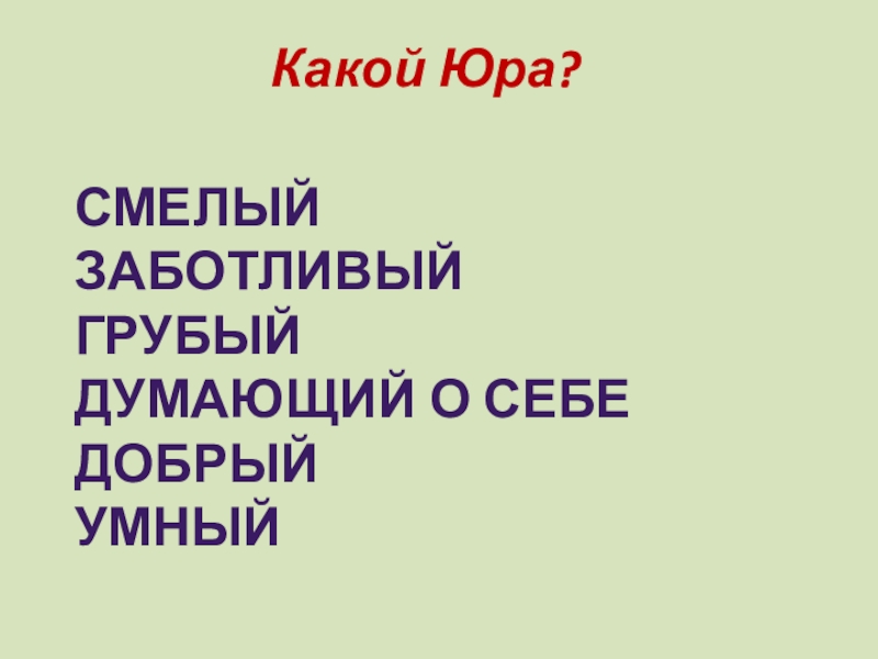 Какой Юра?СмелыйЗаботливыйГрубыйДумающий о себеДобрый умный