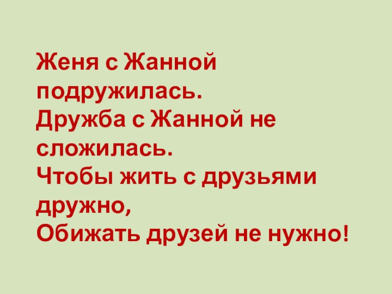 Женя с Жанной подружилась. Дружба с Жанной не сложилась. Чтобы жить с друзьями дружно, Обижать друзей не