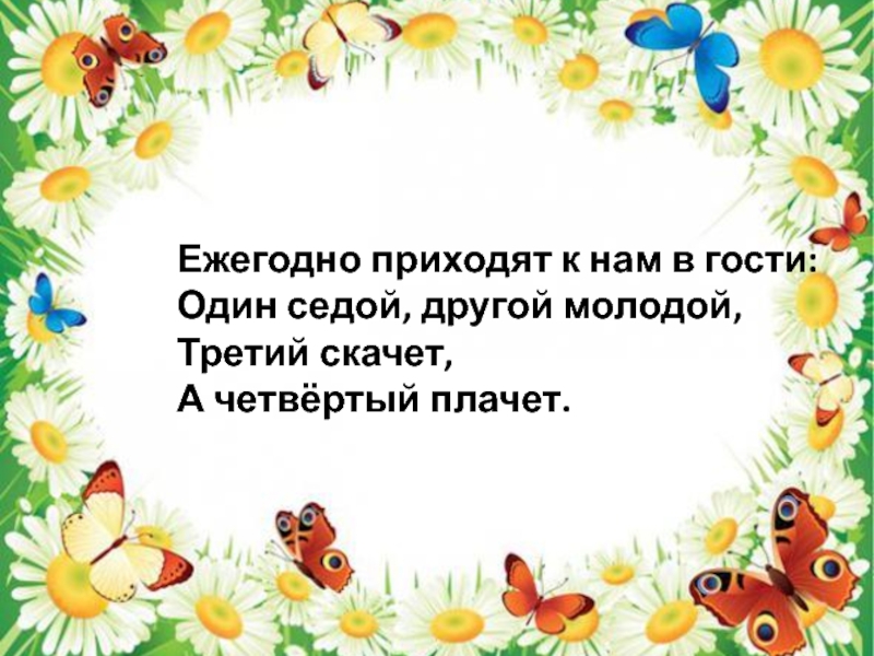 Ежегодно приходят к нам в гости:Один седой, другой молодой,Третий скачет,А четвёртый плачет.