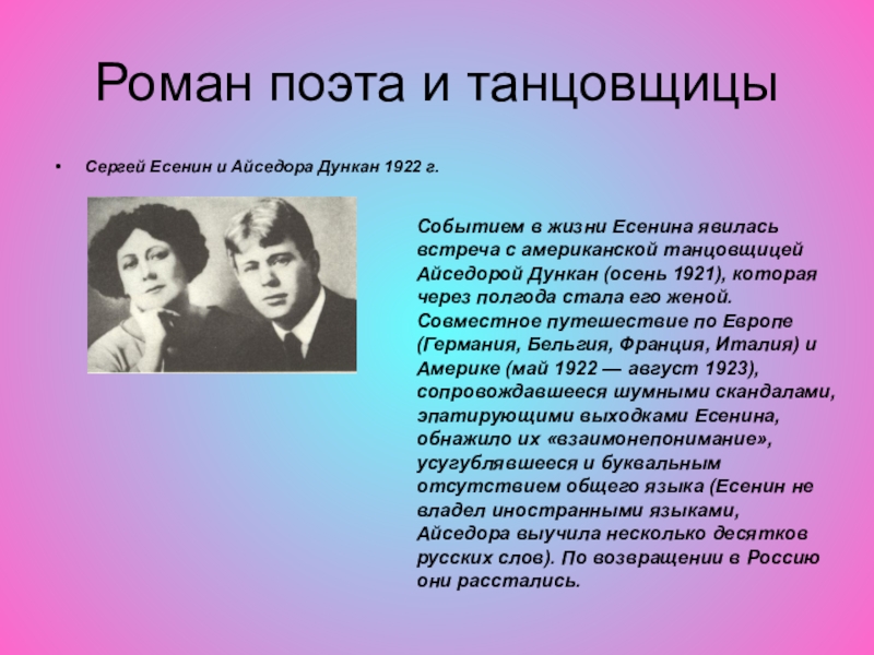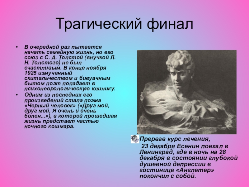 23 декабря Есенин поехал в Ленинград, где в ночь на 28 декабря в состоянии глубокой душевной депрессии в гостинице «Англетер» покончил с собой.