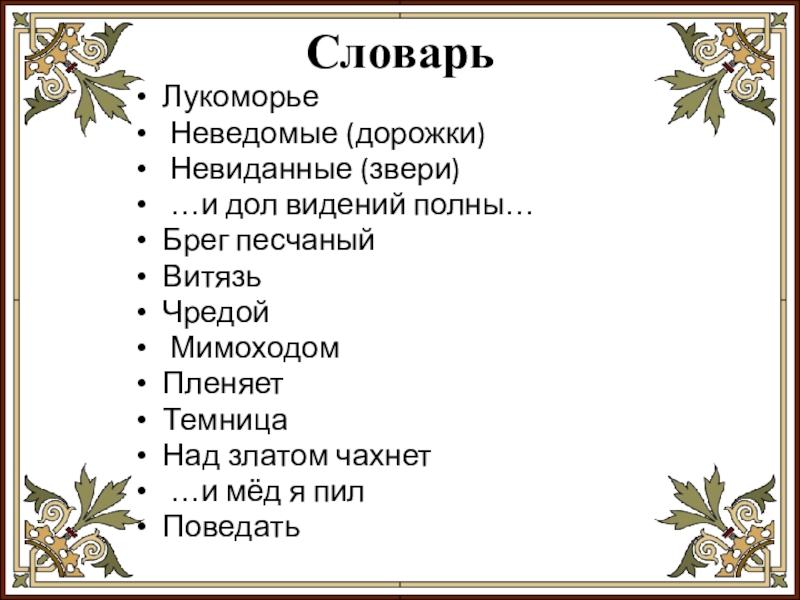 СловарьЛукоморье Неведомые (дорожки) Невиданные (звери) …и дол видений полны…  Брег песчаный Витязь	Чредой	 МимоходомПленяетТемницаНад златом чахнет …и