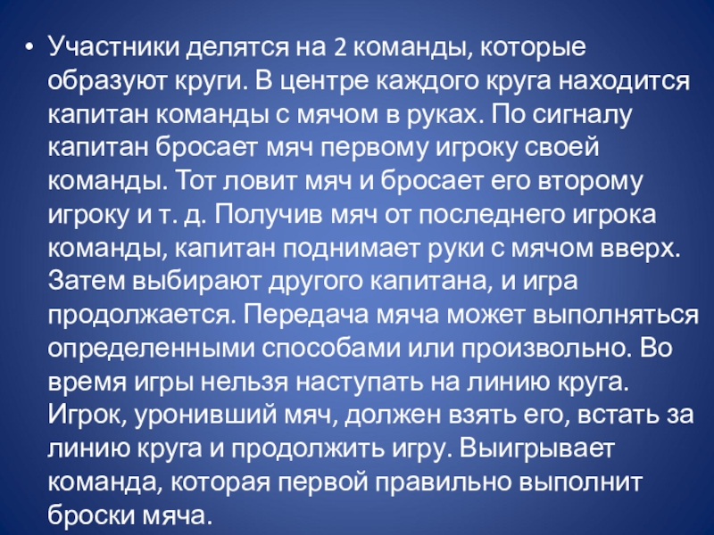 круга находится капитан команды с мячом в руках. По сигналу капитан бросает мяч первому игроку своей команды. Тот ловит мяч и бросает его второму игроку и т. д. Получив мяч от последнего игрока команды, капитан поднимает руки с мячом вверх. Затем выбирают другого капитана, и игра продолжается. Передача мяча может выполняться определенными способами или произвольно. Во время игры нельзя наступать на линию круга. Игрок, уронивший мяч, должен взять его, встать за линию круга и продолжить игру. Выигрывает команда, которая первой правильно выполнит броски мяча.
