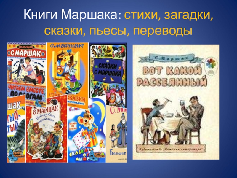 Слайд 4Книги Маршака: стихи, загадки, сказки, пьесы, переводы