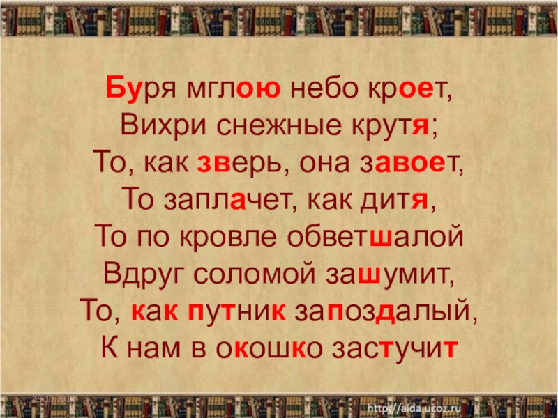 Буря мглою небо кроет, Вихри снежные крутя; То, как зверь, она завоет, То заплачет, как дитя, То