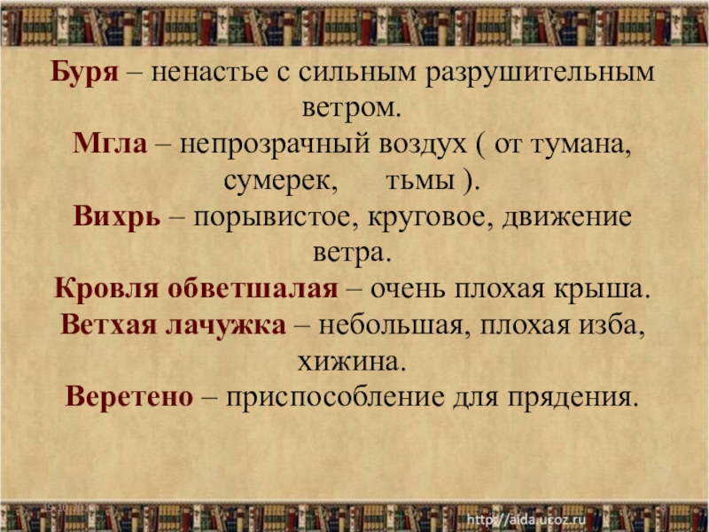 от тумана, сумерек, тьмы ). Вихрь – порывистое, круговое, движение ветра. Кровля обветшалая – очень плохая крыша. Ветхая лачужка – небольшая, плохая изба, хижина. Веретено – приспособление для прядения.