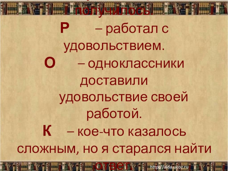 – работал с удовольствием. О – одноклассники доставили удовольствие своей работой. К – кое-что казалось сложным, но я старался найти ответ.