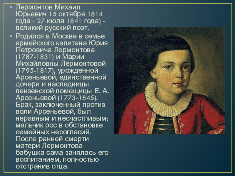 Лермонтов Михаил Юрьевич 15 октября 1814 года - 27 июля 1841 года) - великий русский поэт.Родился в Москве в семье армейского капитана Юрия Петровича Лермонтова (1787-1831) и Марии Михайловны Лермонтовой (1795-1817), урожденной Арсеньевой, единственной дочери и