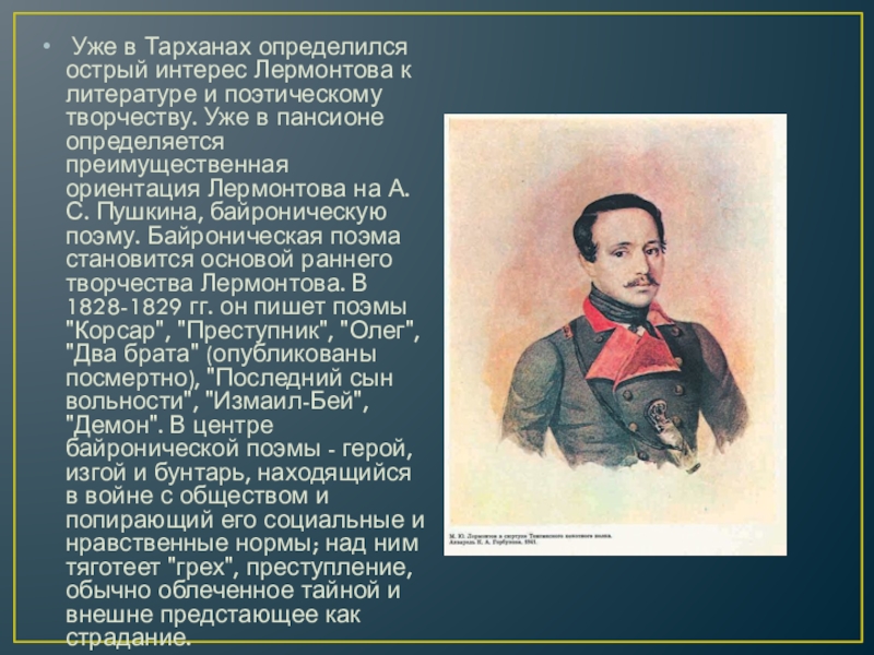 поэтическому творчеству. Уже в пансионе определяется преимущественная ориентация Лермонтова на А. С. Пушкина, байроническую поэму. Байроническая поэма становится основой раннего творчества Лермонтова. В 1828-1829 гг. он пишет поэмы "Корсар", "Преступник", "Олег", "Два брата" (опубликованы посмертно), "Последний сын вольности", "Измаил-Бей", "Демон". В центре байронической поэмы - герой, изгой и бунтарь, находящийся в войне с обществом и попирающий его социальные и нравственные нормы; над ним тяготеет "грех", преступление, обычно облеченное тайной и внешне предстающее как страдание.