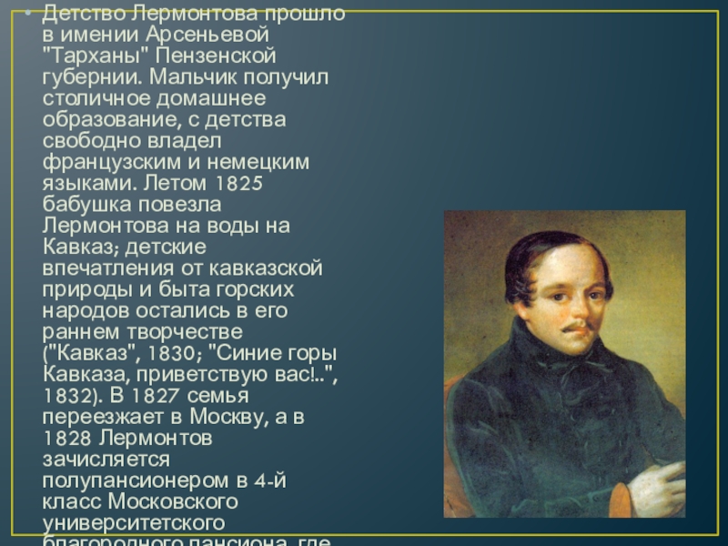 столичное домашнее образование, с детства свободно владел французским и немецким языками. Летом 1825 бабушка повезла Лермонтова на воды на Кавказ; детские впечатления от кавказской природы и быта горских народов остались в его раннем творчестве ("Кавказ", 1830; "Синие горы Кавказа, приветствую вас!..", 1832). В 1827 семья переезжает в Москву, а в 1828 Лермонтов зачисляется полупансионером в 4-й класс Московского университетского благородного пансиона, где получает гуманитарное образование.
