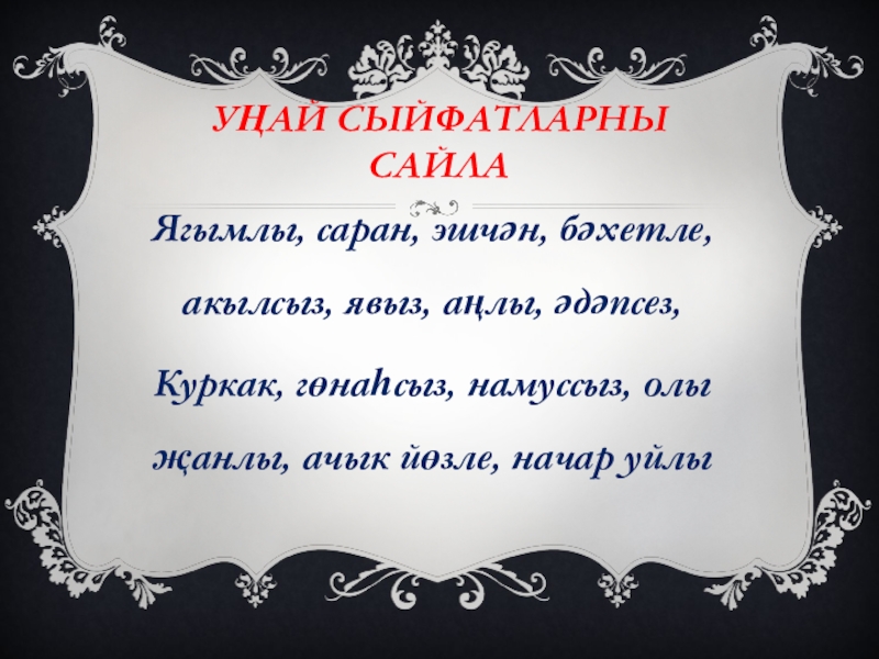 Уңай сыйфатларны сайлаЯгымлы, саран, эшчән, бәхетле, акылсыз, явыз, аңлы, әдәпсез, Куркак, гөнаһсыз, намуссыз, олы җанлы, ачык йөзле, начар уйлы