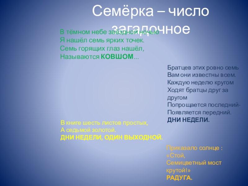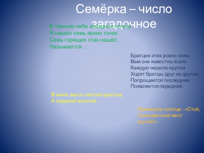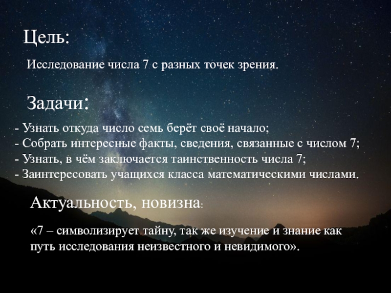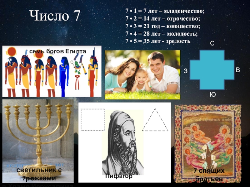 «7 – символизирует тайну, так же изучение и знание как путь исследования неизвестного и невидимого».