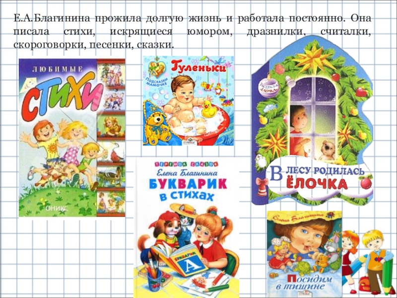 Слайд 15Е.А.Благинина прожила долгую жизнь и работала постоянно. Она писала стихи, искрящиеся