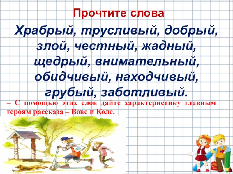– С помощью этих слов дайте характеристику главным героям рассказа – Вове и Коле.