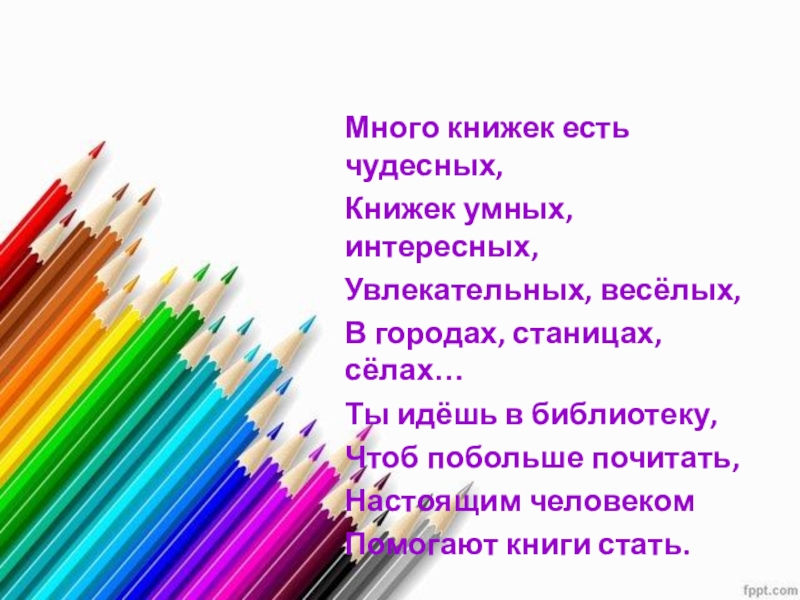 Много книжек есть чудесных,Книжек умных, интересных,Увлекательных, весёлых,В городах, станицах, сёлах…Ты идёшь в библиотеку,Чтоб побольше почитать,Настоящим человекомПомогают книги стать.