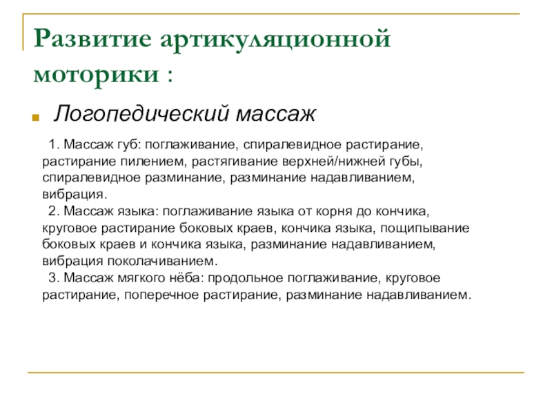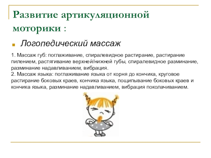 2. Массаж языка: поглаживание языка от корня до кончика, круговое растирание боковых краев, кончика языка, пощипывание боковых краев и кончика языка, разминание надавливанием, вибрация поколачиванием.