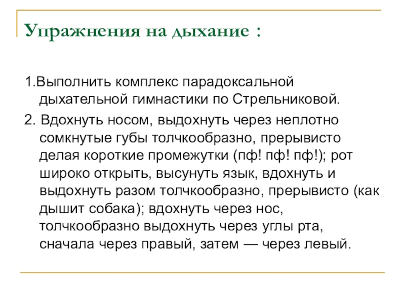 1.Выполнить комплекс парадоксальной дыхательной гимнастики по Стрельниковой.
