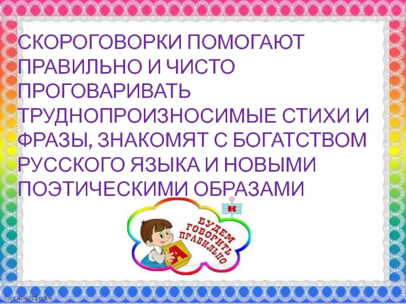СКОРОГОВОРКИ ПОМОГАЮТ ПРАВИЛЬНО И ЧИСТО ПРОГОВАРИВАТЬ ТРУДНОПРОИЗНОСИМЫЕ СТИХИ И ФРАЗЫ, ЗНАКОМЯТ С БОГАТСТВОМ РУССКОГО ЯЗЫКА И НОВЫМИ ПОЭТИЧЕСКИМИ ОБРАЗАМИ
