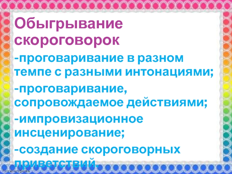 Обыгрывание скороговорок-проговаривание в разном темпе с разными интонациями;-проговаривание, сопровождаемое действиями;-импровизационное инсценирование;-создание скороговорных приветствий.