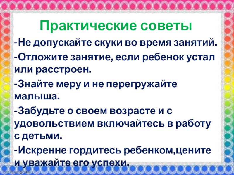 Практические советы-Не допускайте скуки во время занятий.-Отложите занятие, если ребенок устал или расстроен.-Знайте меру и не перегружайте