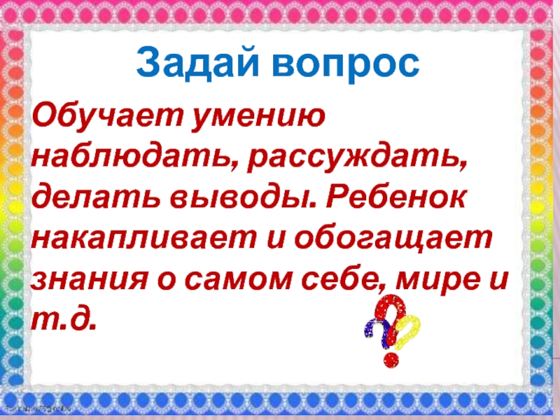 Задай вопросОбучает умению наблюдать, рассуждать, делать выводы. Ребенок накапливает и обогащает знания о самом себе, мире и