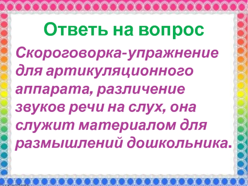 Ответь на вопросСкороговорка-упражнение для артикуляционного аппарата, различение звуков речи на слух, она служит материалом для размышлений дошкольника.