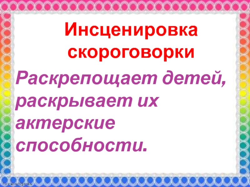 Инсценировка скороговоркиРаскрепощает детей, раскрывает их актерские способности.
