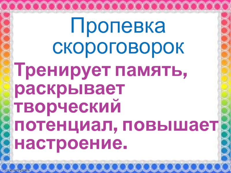 Пропевка скороговорокТренирует память, раскрывает творческий потенциал, повышает настроение.
