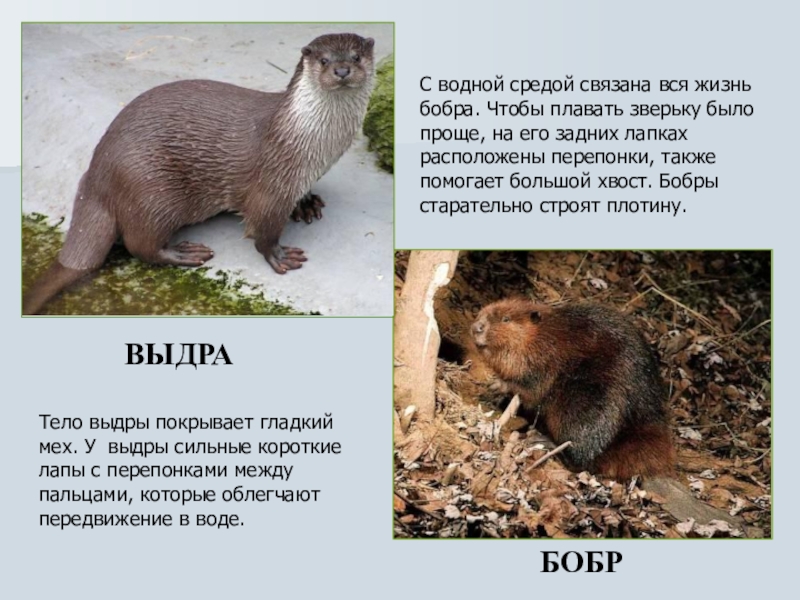 С водной средой связана вся жизнь бобра. Чтобы плавать зверьку было проще, на его задних лапках расположены перепонки, также помогает большой хвост. Бобры старательно строят плотину.