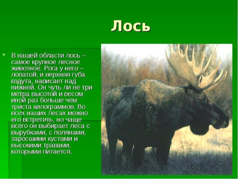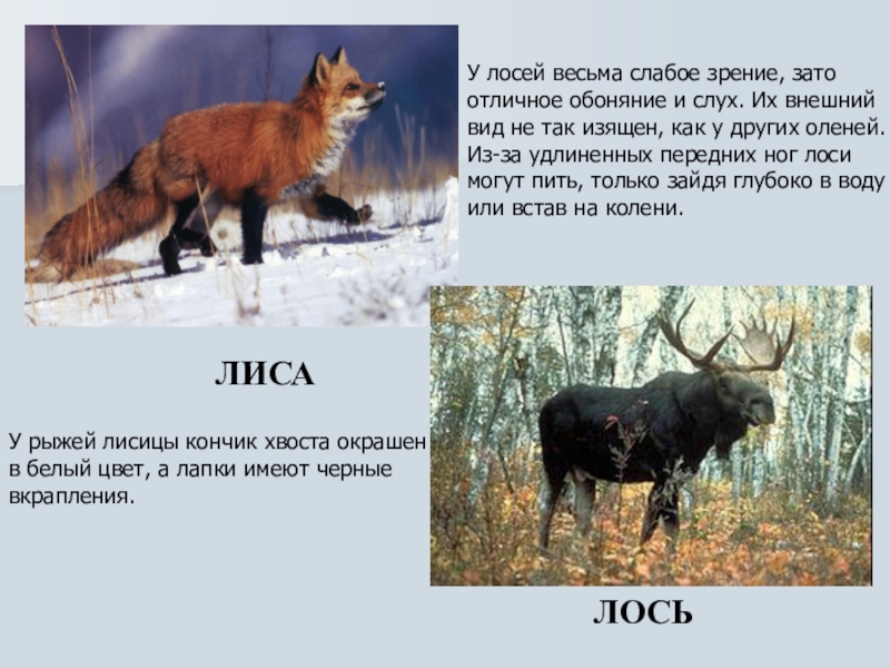 У лосей весьма слабое зрение, зато отличное обоняние и слух. Их внешний вид не так изящен, как у других оленей. Из-за удлиненных передних ног лоси могут пить, только зайдя глубоко в воду или встав на колени.