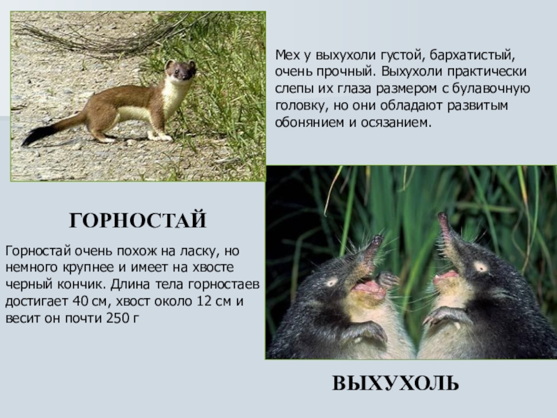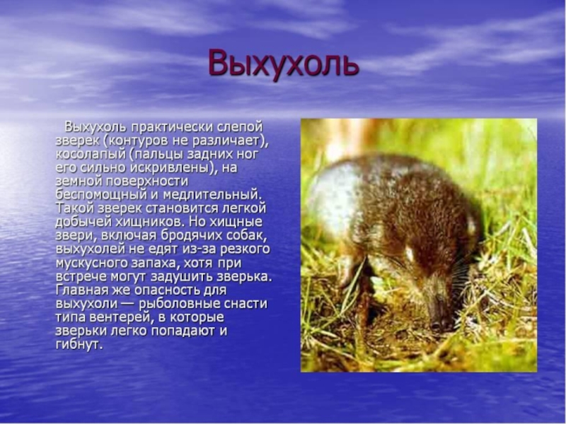 Мех у выхухоли густой, бархатистый, очень прочный. Выхухоли практически слепы их глаза размером с булавочную головку, но они обладают развитым обонянием и осязанием.