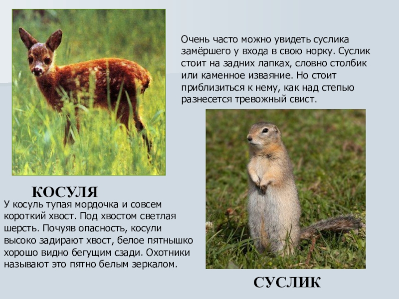 Очень часто можно увидеть суслика замёршего у входа в свою норку. Суслик стоит на задних лапках, словно столбик или каменное изваяние. Но стоит приблизиться к нему, как над степью разнесется тревожный свист.