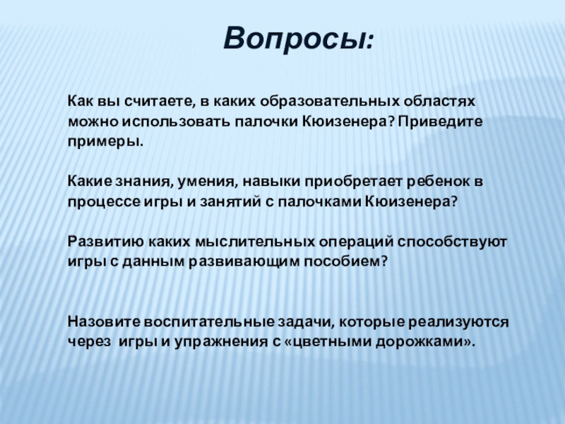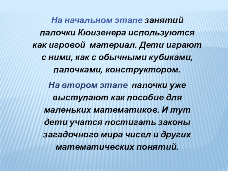 Слайд 8На начальном этапе занятий палочки Кюизенера используются как игровой материал. Дети играют с