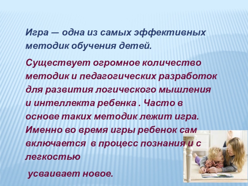 количество методик и педагогических разработок для развития логического мышления и интеллекта ребенка . Часто в основе таких методик лежит игра. Именно во время игры ребенок сам включается в процесс познания и с легкостью