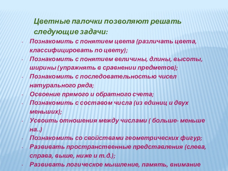 Слайд 7Цветные палочки позволяют решать следующие задачи: