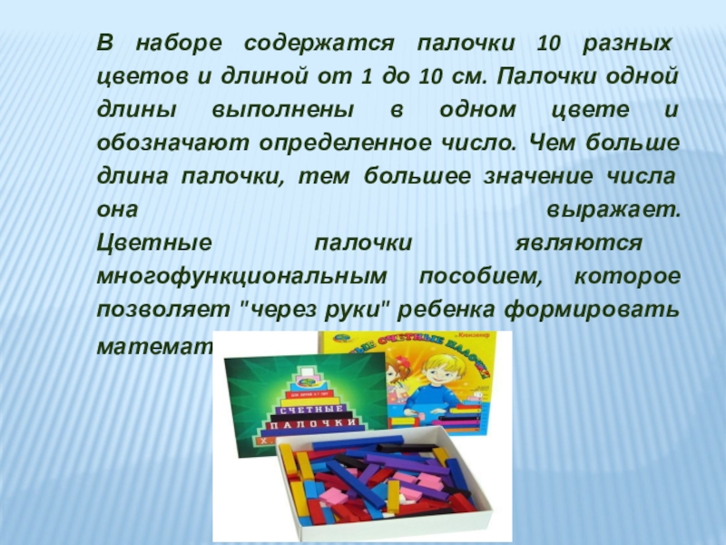 до 10 см. Палочки одной длины выполнены в одном цвете и обозначают определенное число. Чем больше длина палочки, тем большее значение числа она выражает.