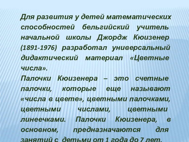 Кюизенер (1891-1976) разработал универсальный дидактический материал «Цветные числа».