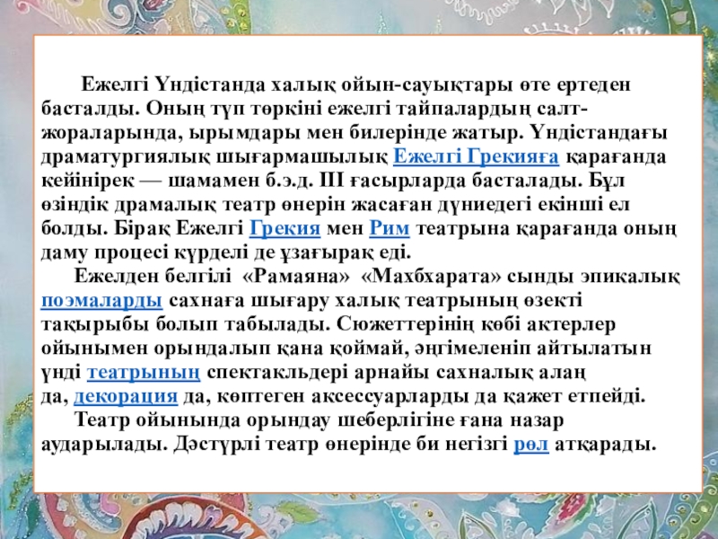 Жер шарындағы қасиетті де, құдіретті мәдениеттердің бірі — Үнді мемлекетінде қалыптасып өркендеген үнді-будда мәдениеті. Үнді елінің ғасырлар бойғы мәдени дәстүрлері оның талантты халқының діни сана-сезімінің қалыптасып, дамуымен тығыз байланысты болды.