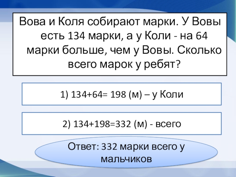 1) 134+64= 198 (м) – у Коли