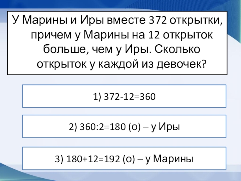 3) 180+12=192 (о) – у Марины