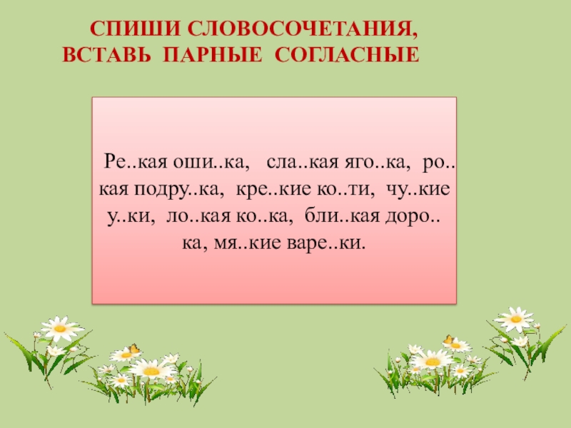СПИШИ СЛОВОСОЧЕТАНИЯ, ВСТАВЬ ПАРНЫЕ СОГЛАСНЫЕ
