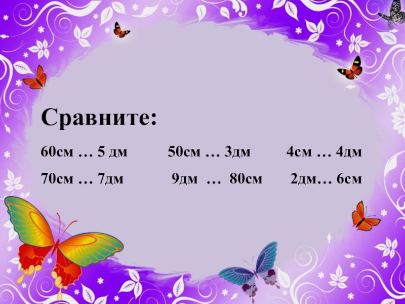 Сравните:60см … 5 дм     50см … 3дм     4см …