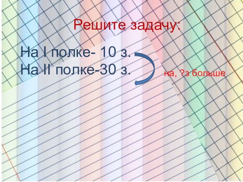 Решите задачу:На I полке- 10 з.На II полке-30 з.на, ?з больше