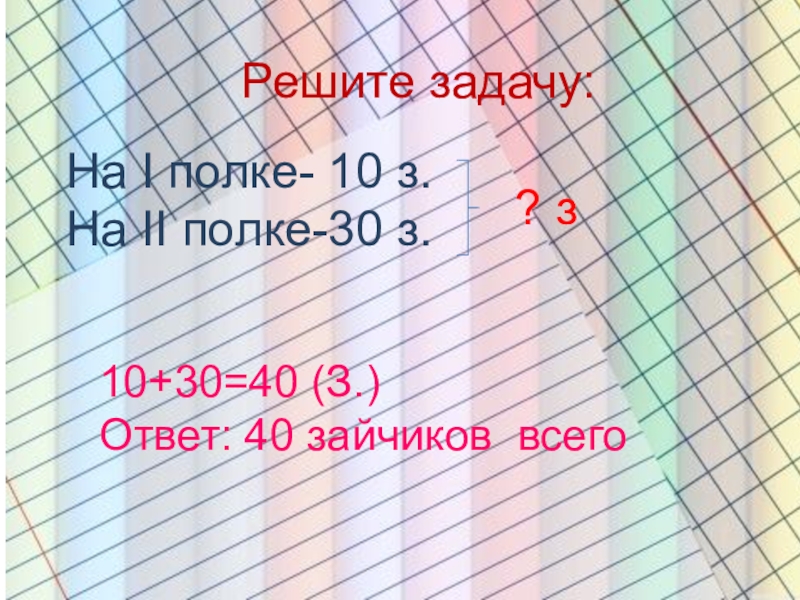 Решите задачу:На I полке- 10 з.На II полке-30 з.? з10+30=40 (З.)Ответ: 40 зайчиков всего