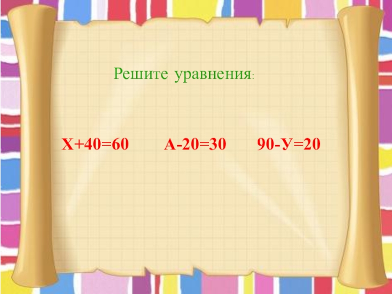 Решите уравнения:Х+40=60    А-20=30    90-У=20