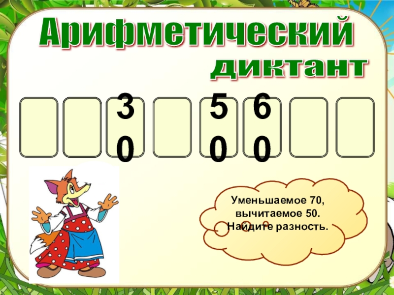 2506030Уменьшаемое 70, вычитаемое 50. Найдите разность.