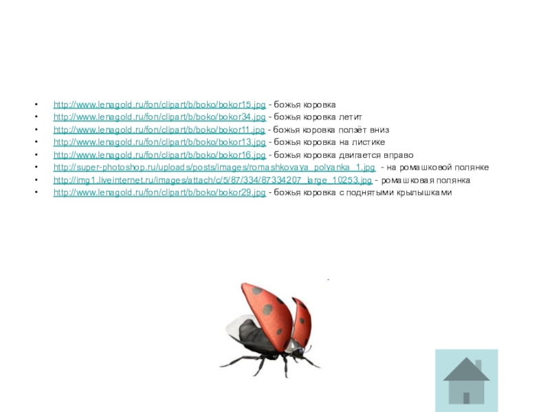 http://www.lenagold.ru/fon/clipart/b/boko/bokor15.jpg - божья коровкаhttp://www.lenagold.ru/fon/clipart/b/boko/bokor34.jpg - божья коровка летитhttp://www.lenagold.ru/fon/clipart/b/boko/bokor11.jpg - божья коровка ползёт внизhttp://www.lenagold.ru/fon/clipart/b/boko/bokor13.jpg - божья коровка на