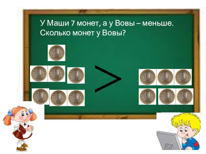 Слайд 34У Маши 7 монет, а у Вовы – меньше. Сколько монет