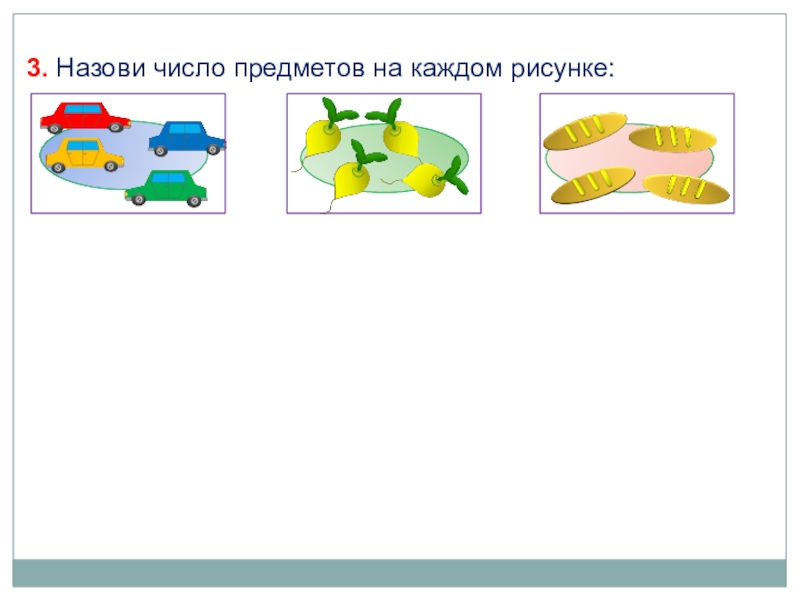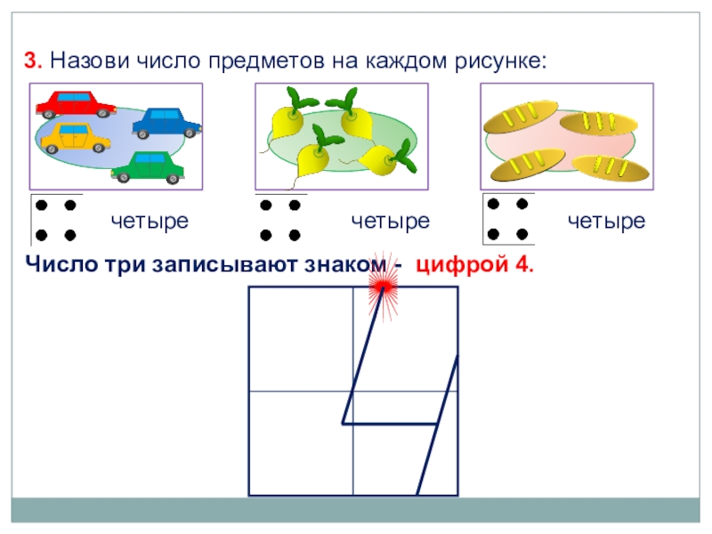 3. Назови число предметов на каждом рисунке:четыреЧисло три записывают знаком - цифрой 4.четыречетыре